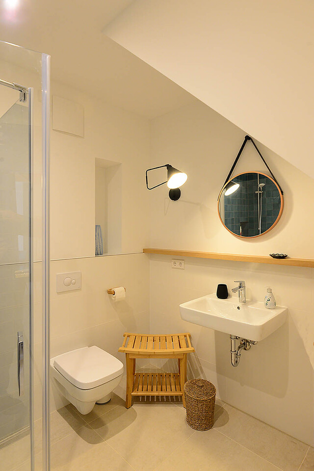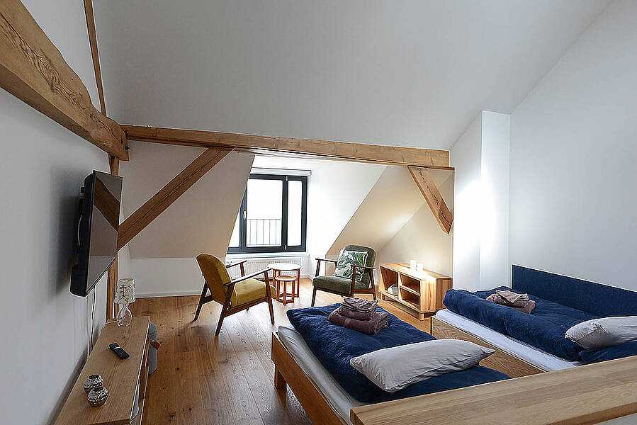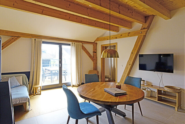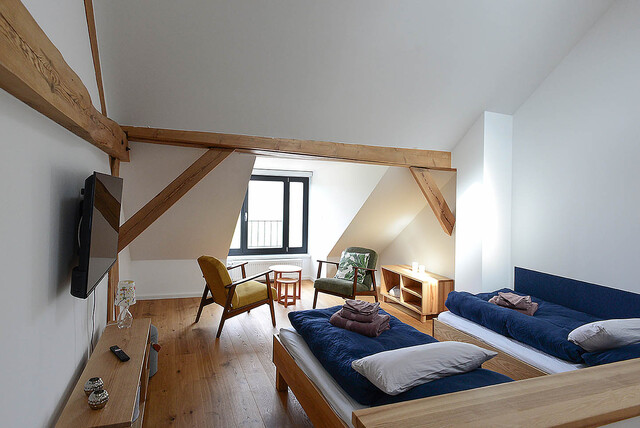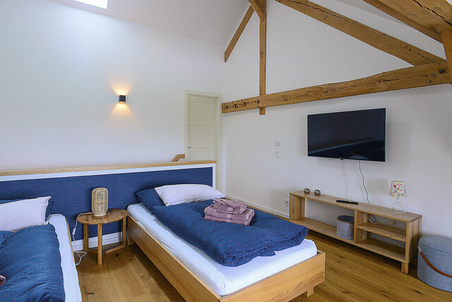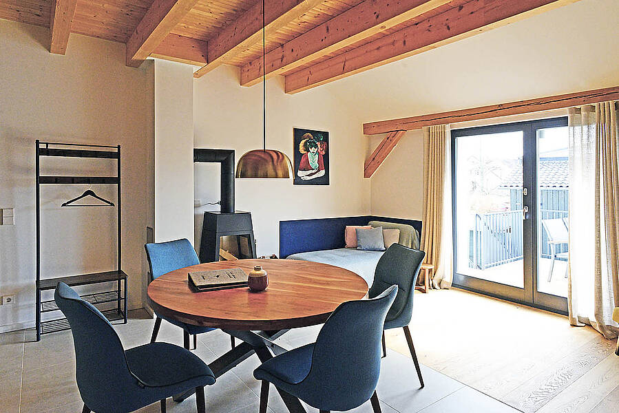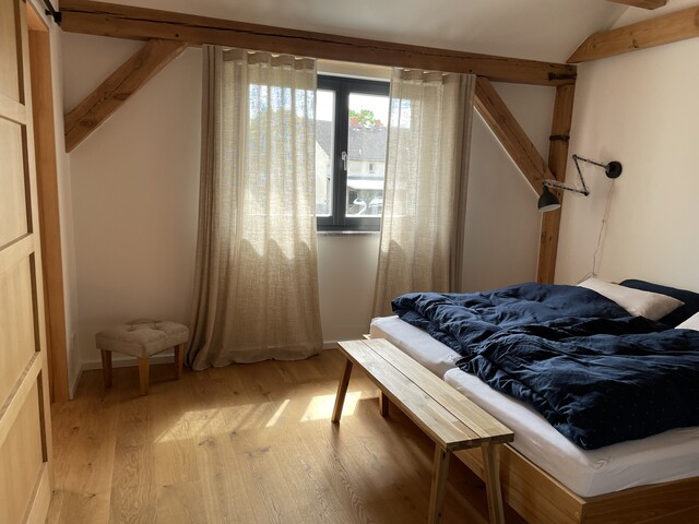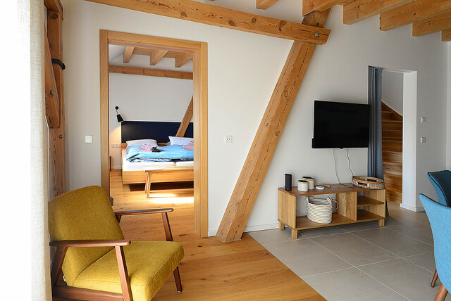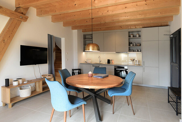 - Offene Raumgestaltung: Das Appartment liegt im 1. Obergeschoss des Scheunenensembles. Beim Eintritt in die Wohnung werden Sie von einer großzügigen, offen gestalteten Raumaufteilung begrüßt, die eine vollausgestattete Küche, einen Essbereich sowie ein Wohnzimmer umfasst. Hier können Sie sich sofort wie zu Hause fühlen.