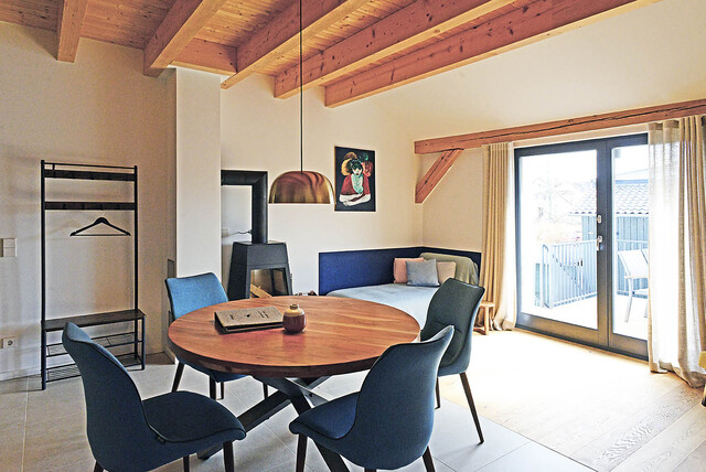 - Gemütlicher Kaminbereich: Für entspannte Stunden sorgt die Loungeliege vor dem Kamin, die zusammen mit einem bequemen Sessel für behagliche Wärme und gemütliches Beisammensein sorgt. Hier können Sie die Abende bei einem guten Buch oder in anregenden Gesprächen ausklingen lassen.